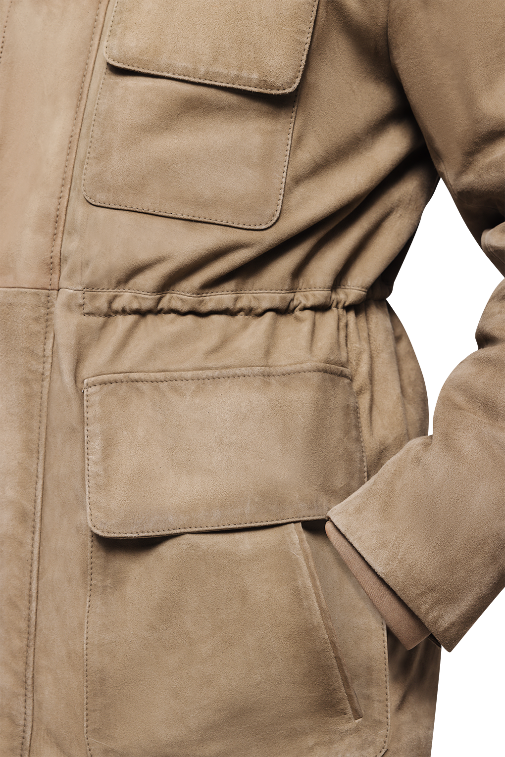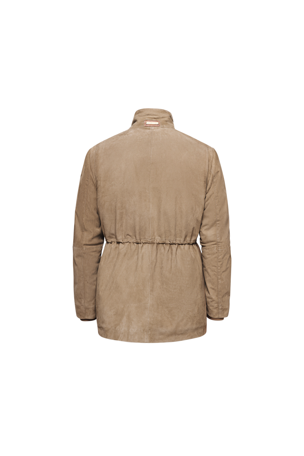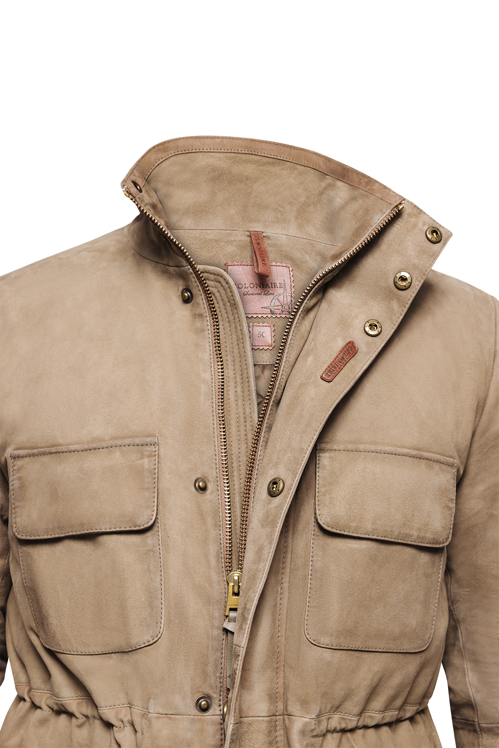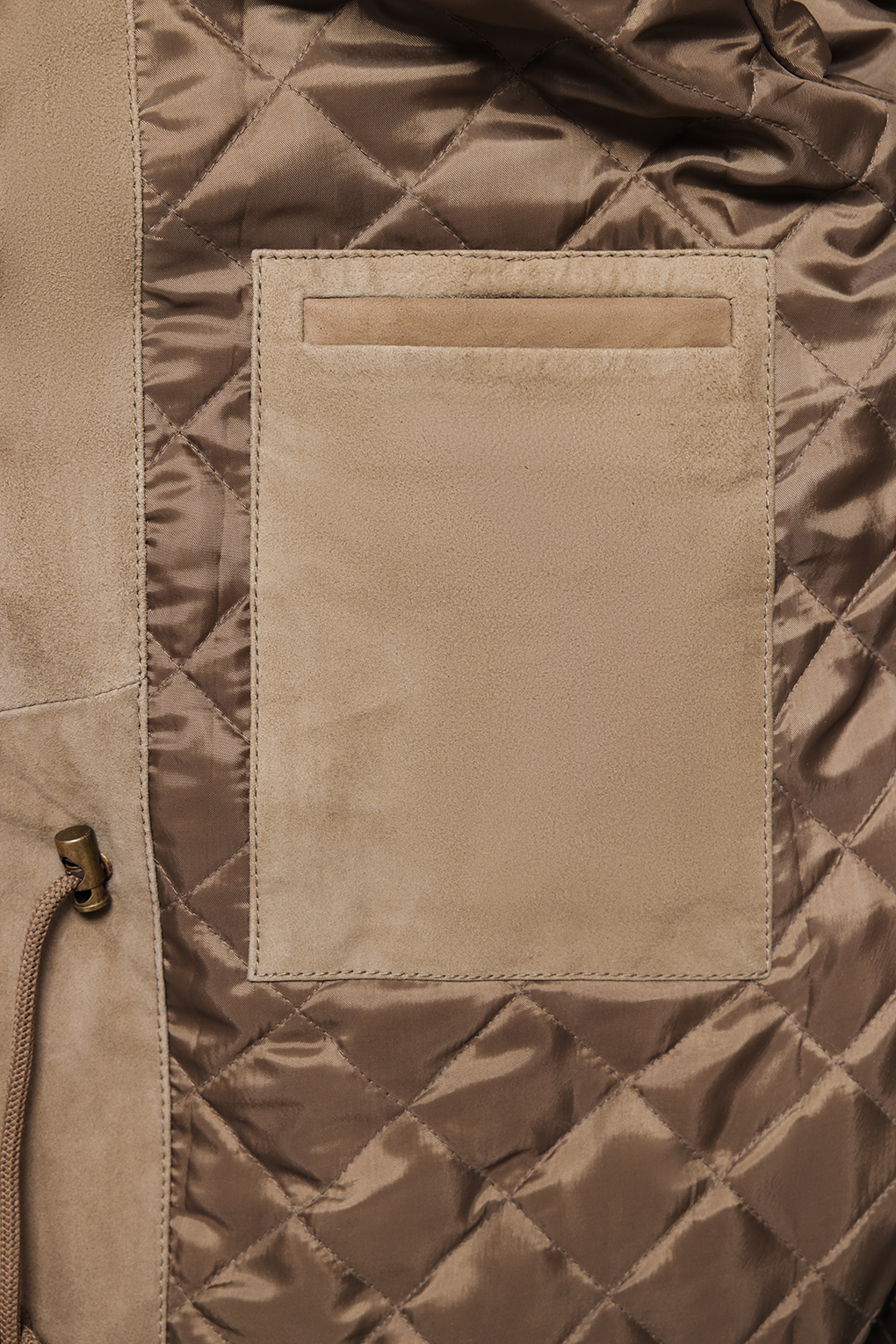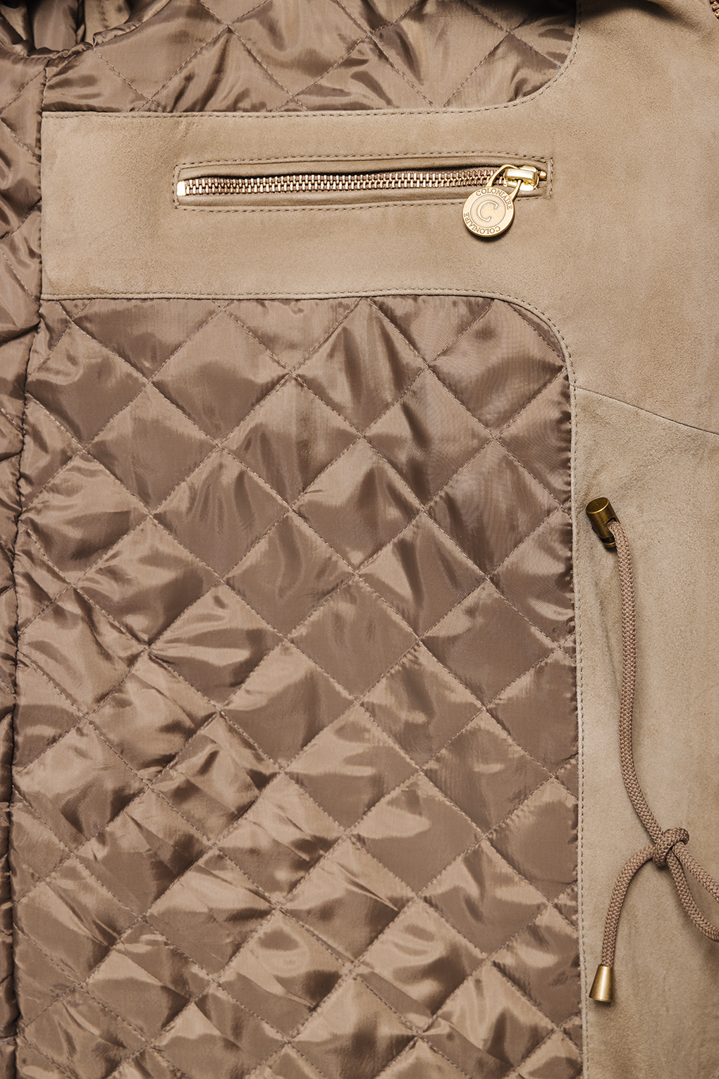 Light padded field jacket/parkas with drawstring in waist and 4 front patch pockets with flap closed with magnet buttons. Two quick access pockets on top of lower pockets. 2-way zipper under the front placket/panel. The front panel is closed with snap buttons.