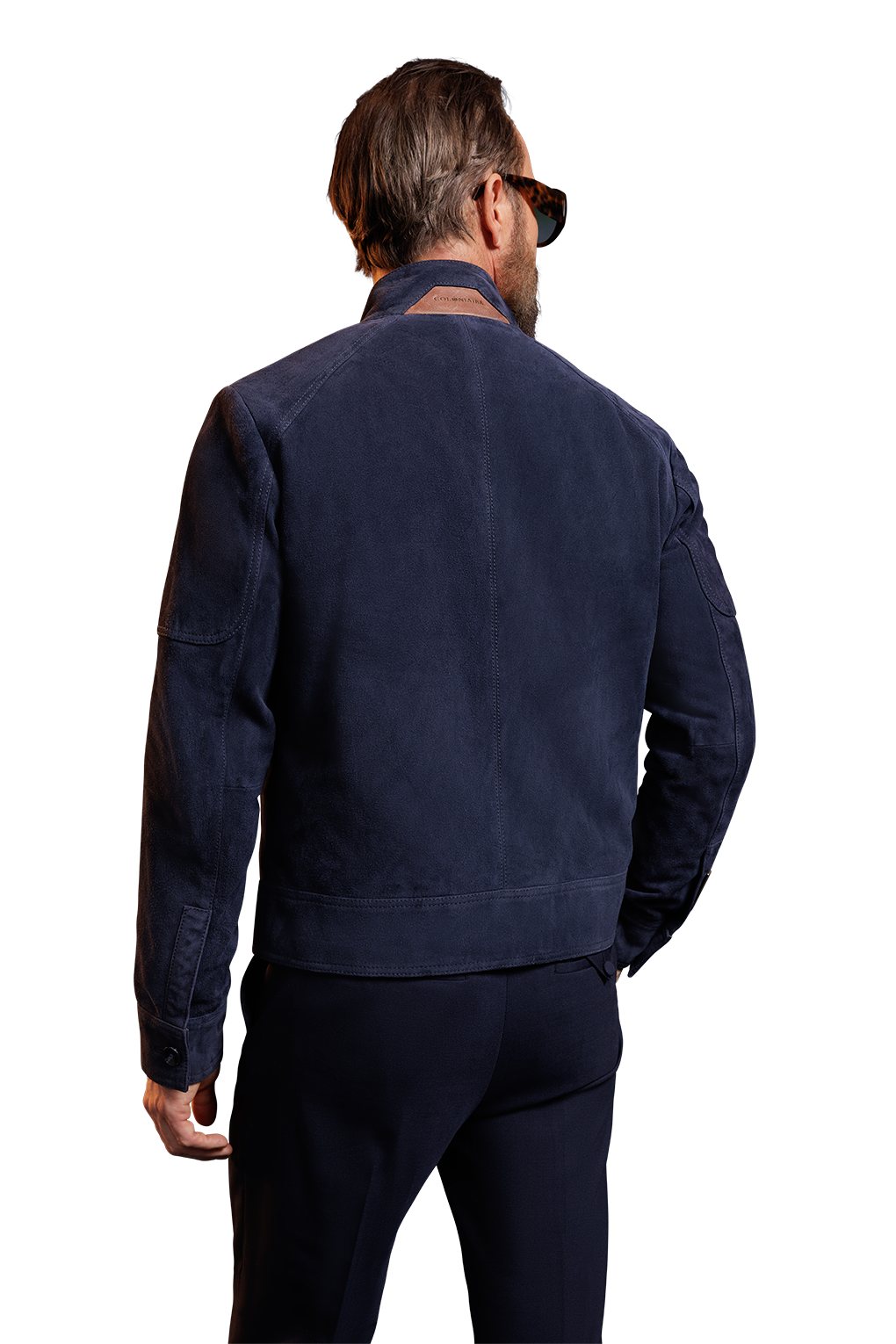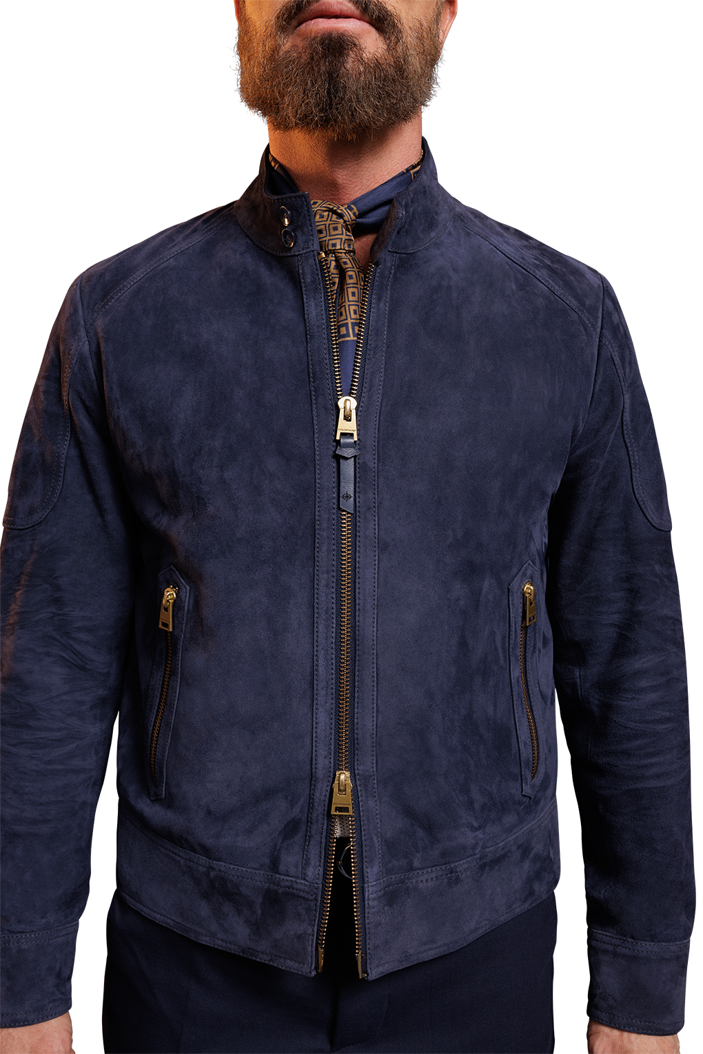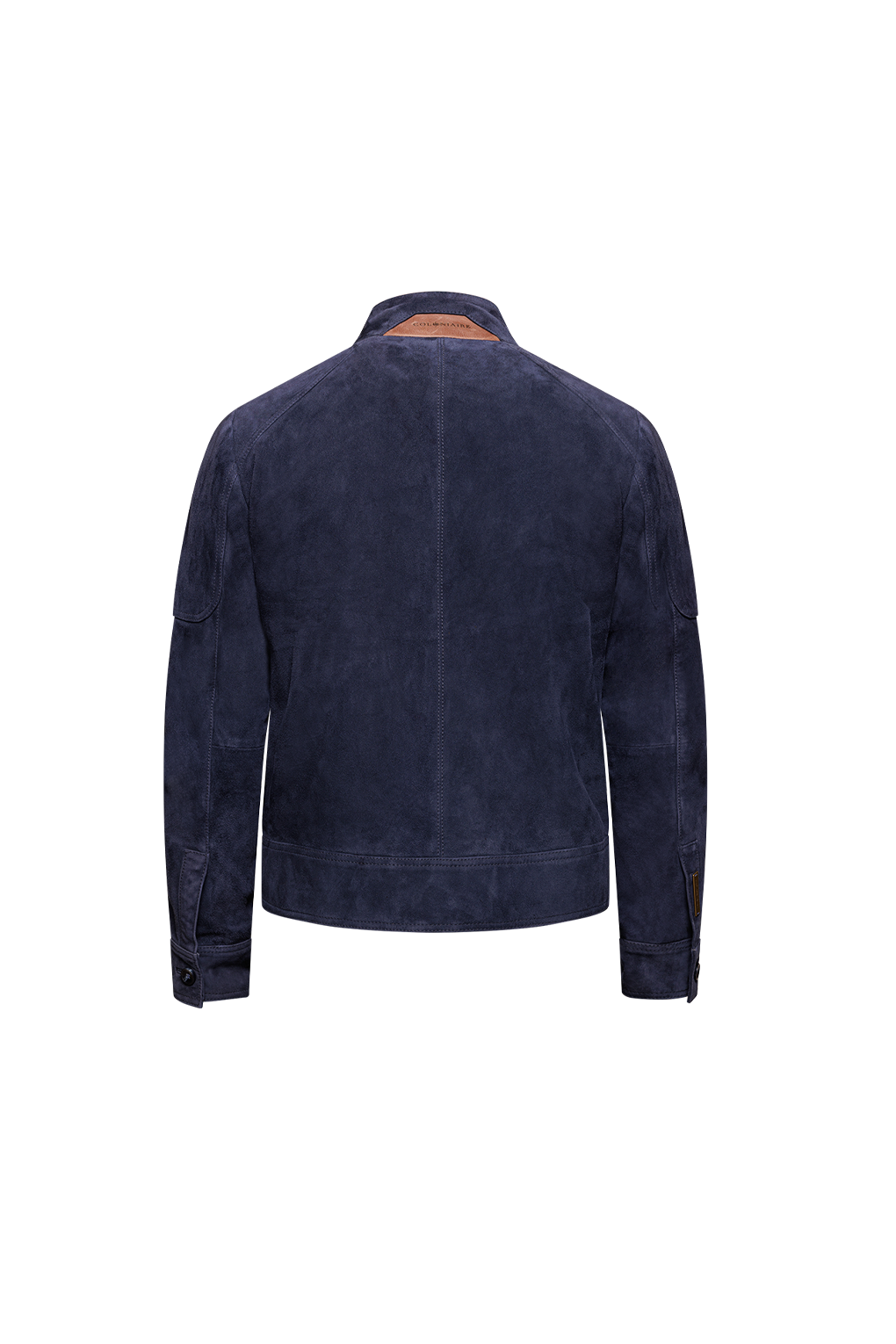 Café racer jacket with 2-way closure brass coloured zipper in front. The garment featuring a standed collar closed with 2 buttons, 2 lower zip pockets and barell cuffs closed with button.. It has a wide hem in bottom and a raglan shoulder patch. The jacket in fully-lined with a blue and white cotton stripe.