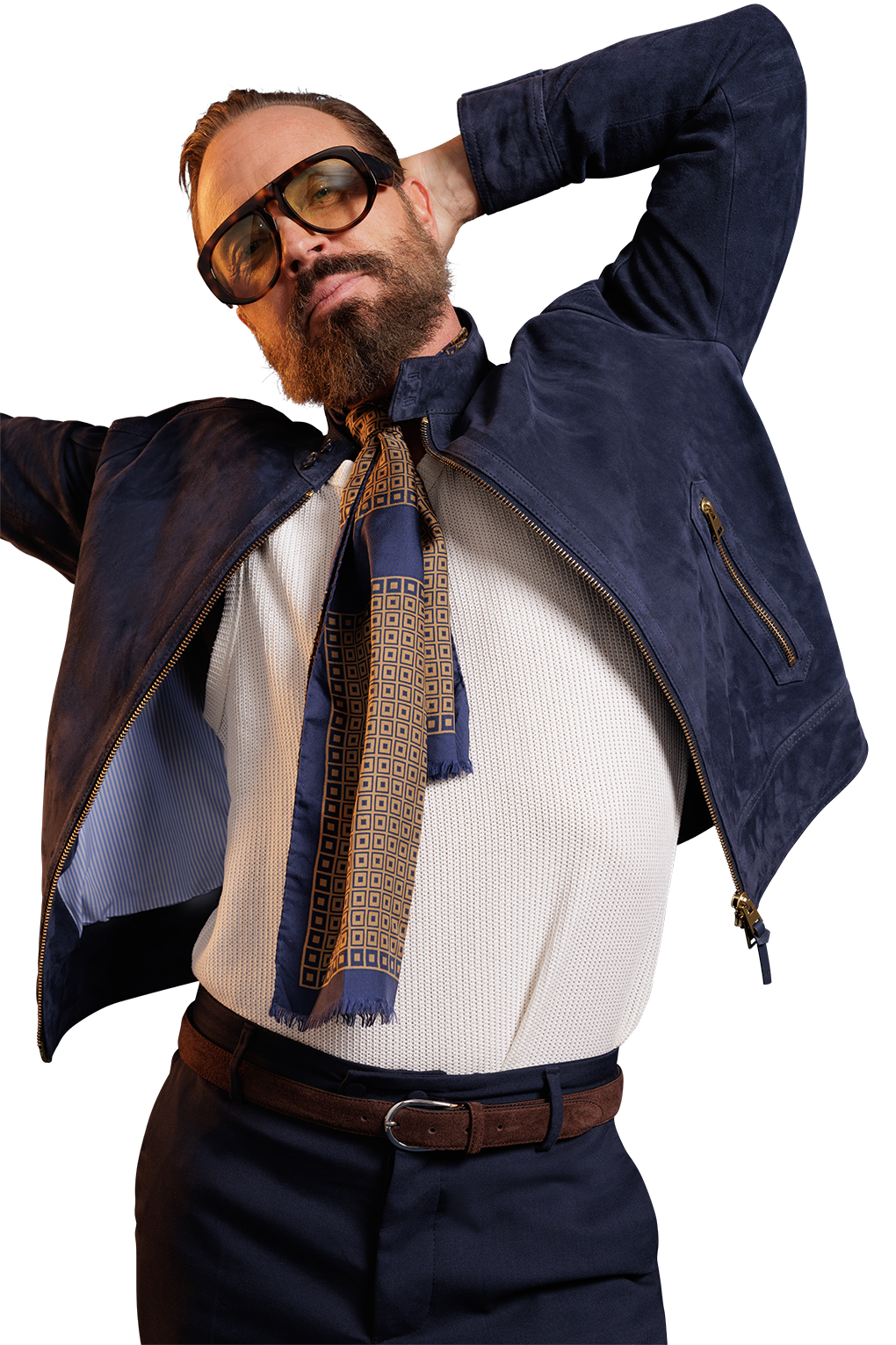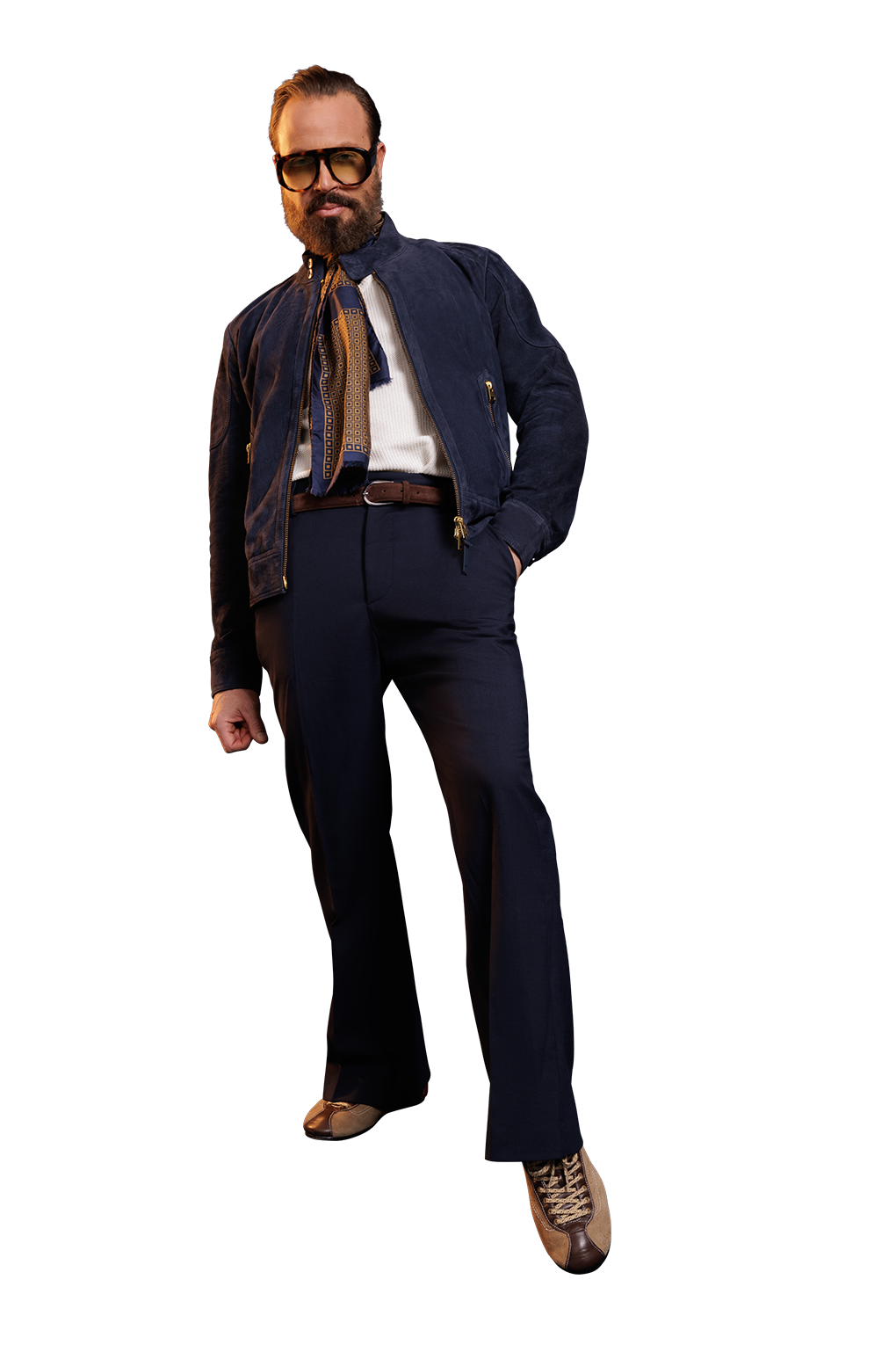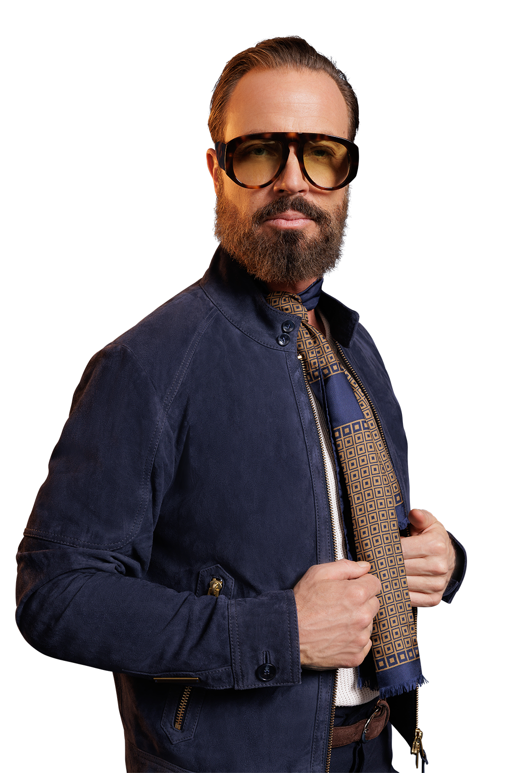 Café racer jacket with 2-way closure brass coloured zipper in front. The garment featuring a standed collar closed with 2 buttons, 2 lower zip pockets and barell cuffs closed with button.. It has a wide hem in bottom and a raglan shoulder patch. The jacket in fully-lined with a blue and white cotton stripe.