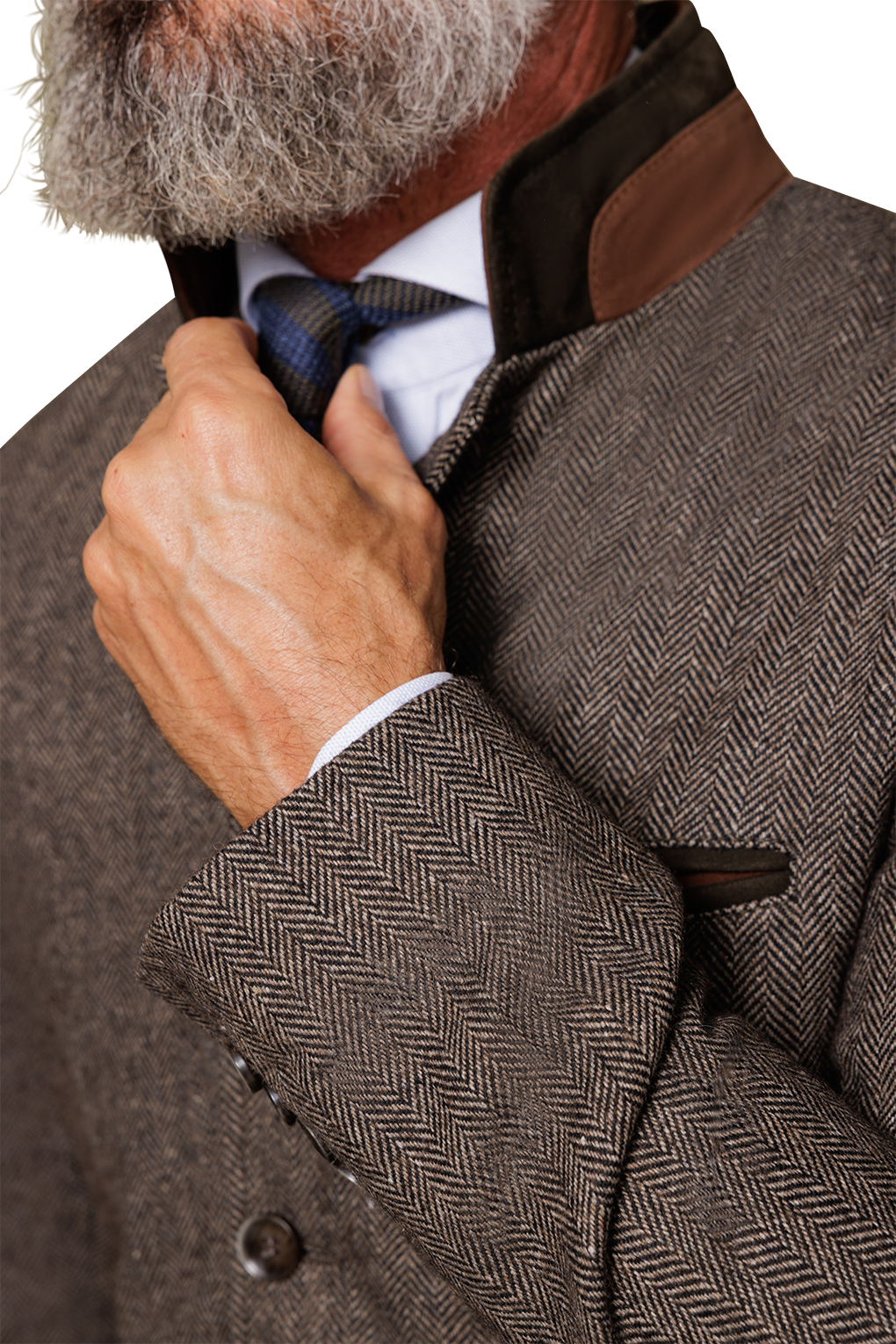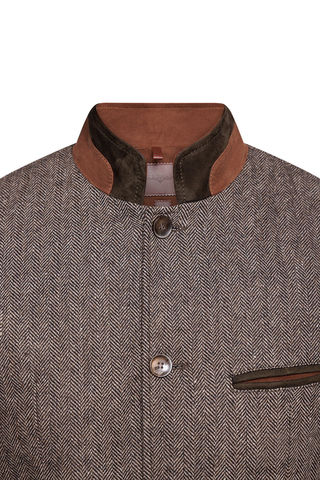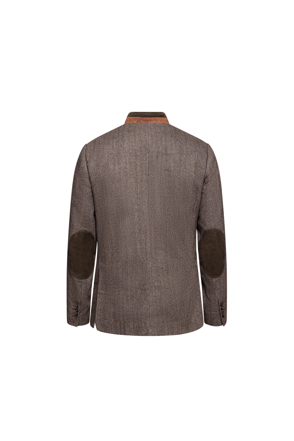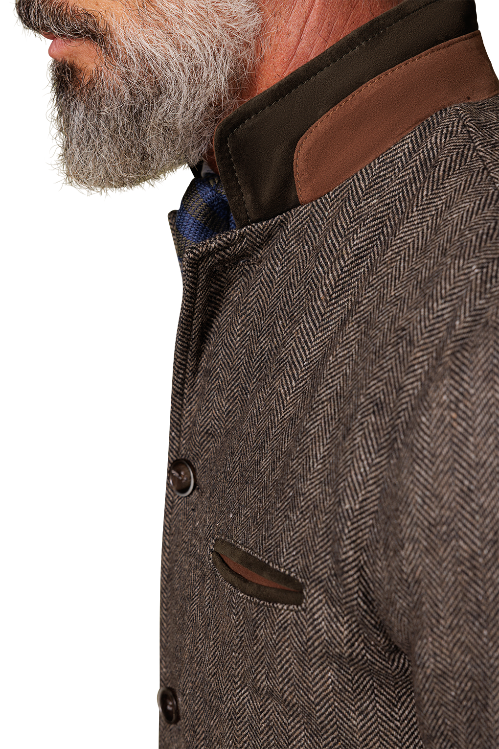 Traditional country sports jacket crafted in herringbone tweed wool with contrast suede detailing