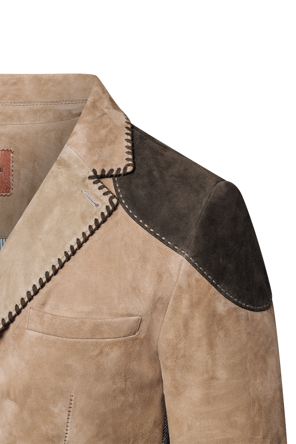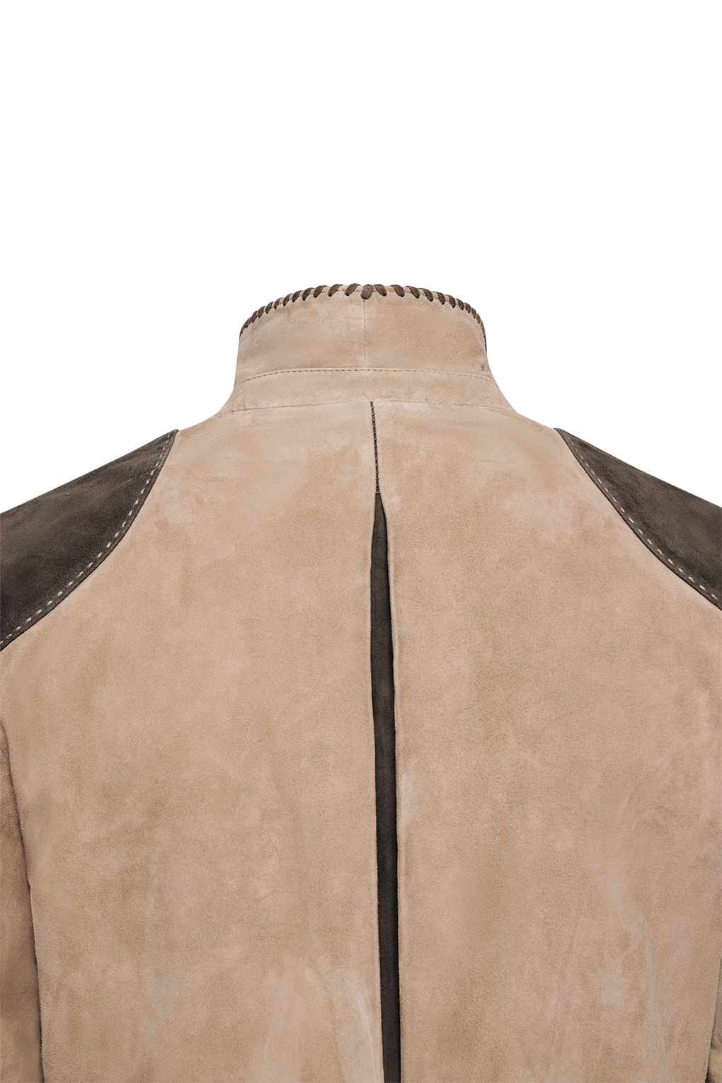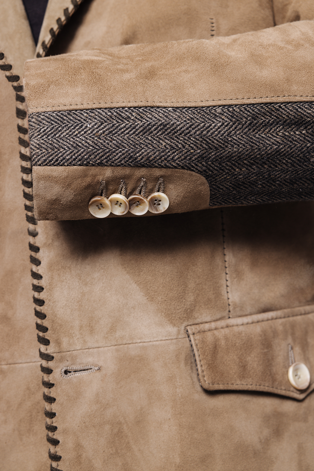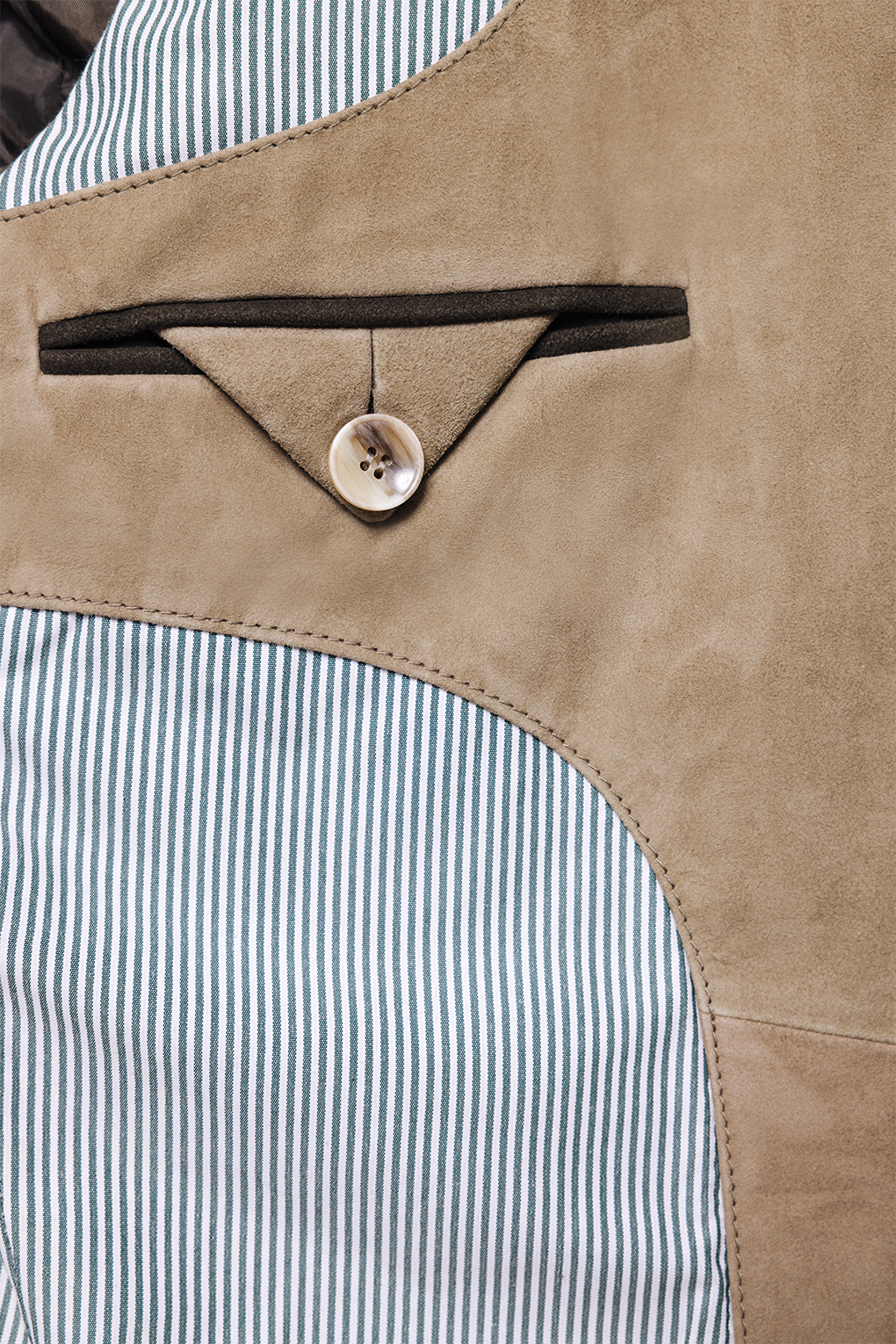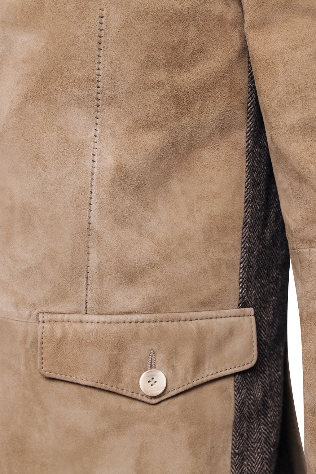 Unique blazer in goat suede with contrast army green binding on lapel and in front. Tweed contrast fabric on side of blazer and on part of lower sleeves, suede shoulder patches in contrast colour. Action center pleat in back with contrast suede colour inside gap.